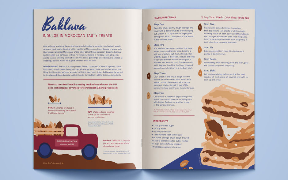 Love Bird’s Retreat is an international cultural booklet that aims to grab the attention of newlywed lovers looking for a romantic honeymoon destination. This booklet details the romantic adventures for two in a Moroccan landmark, event and dessert. Unlike other typical honeymoon destinations, this booklet showcases the not-so-visited places in Morocco that make for a unique honeymoon experience.